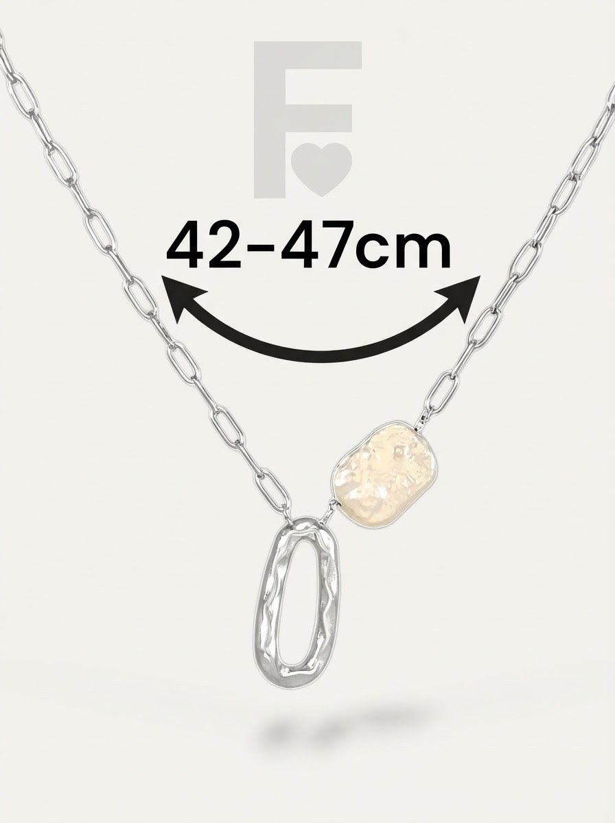 * El collar Nacaré presenta un nácar natural, cuidadosamente seleccionado por su brillo y textura, combinado con la durabilidad del acero quirúrgico 316L. Su diseño bohemio y moderno presenta un cuadrado y un óvalo de nácar, formas orgánicas que evocan la fluidez del mar.