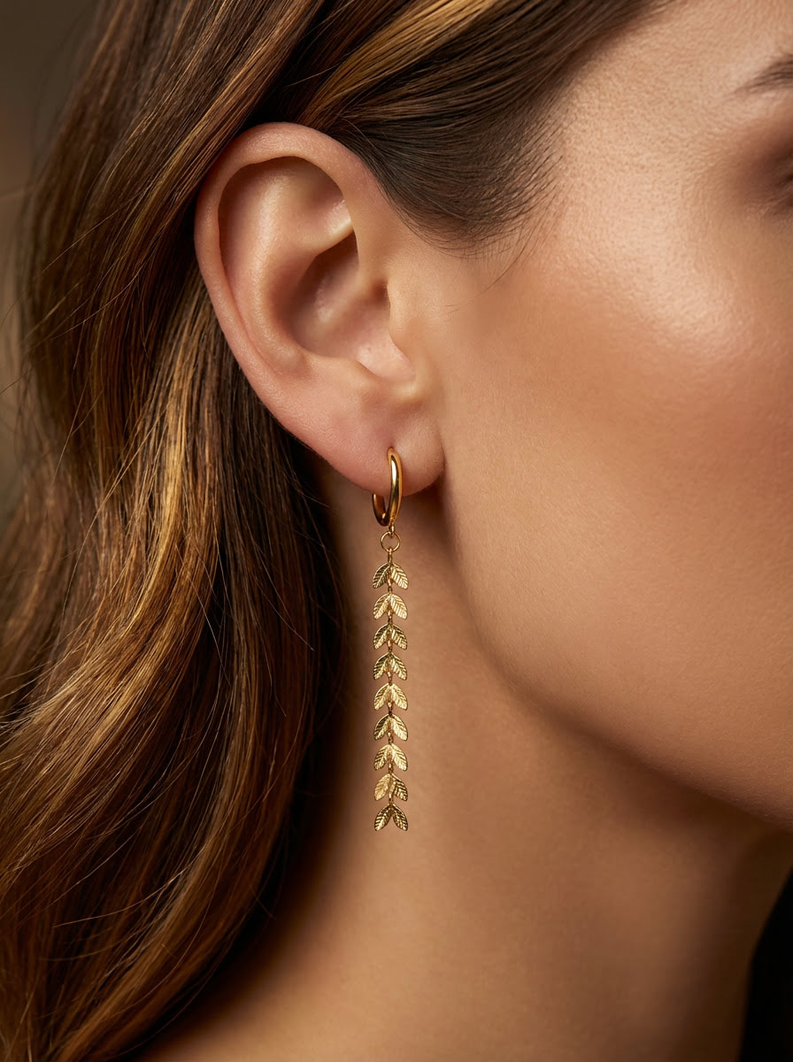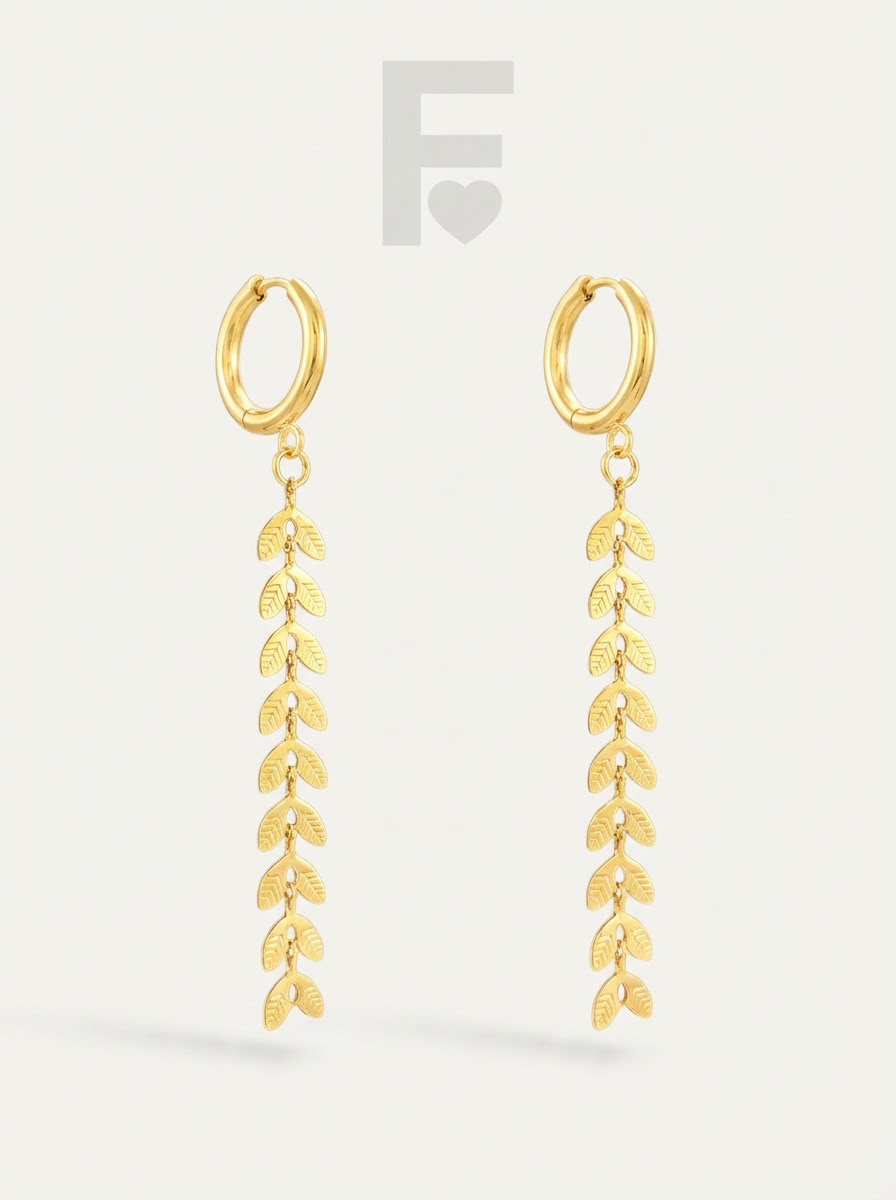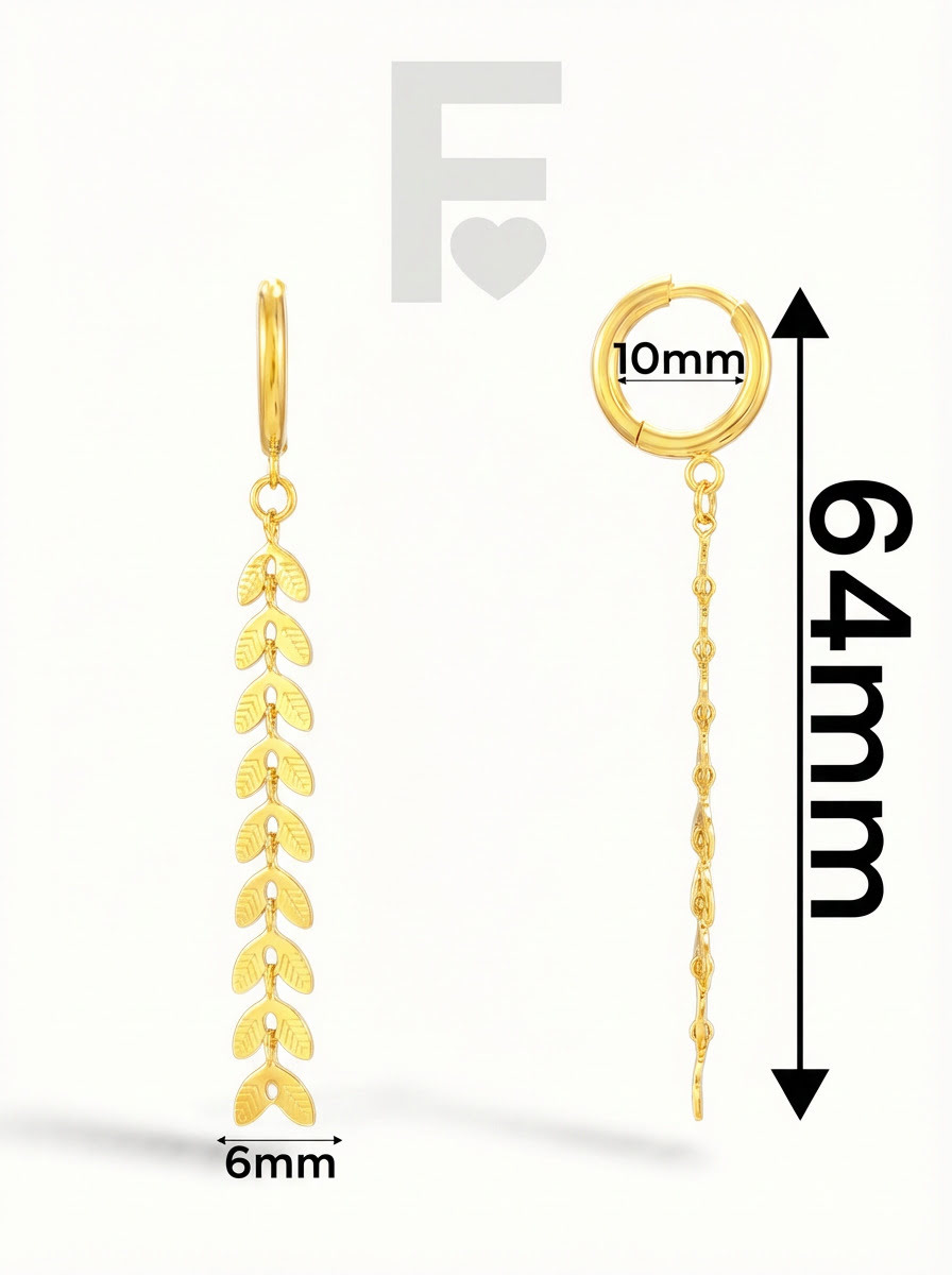 Estos pendientes únicos presentan un aro de 10mm del que cuelga una preciosa espiga dorada, símbolo de abundancia, prosperidad, crecimiento y renovación. Con 64mm de largo, estos pendientes son perfectos para mujeres que no temen destacar con un toque de distinción y elegancia.